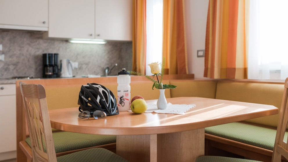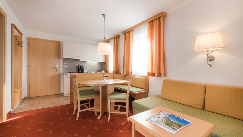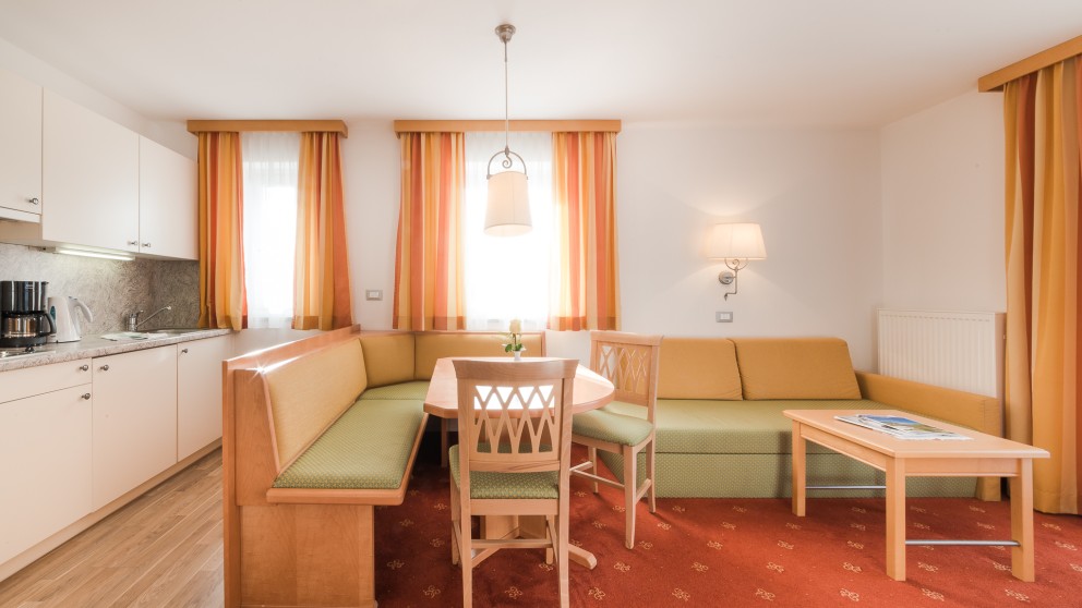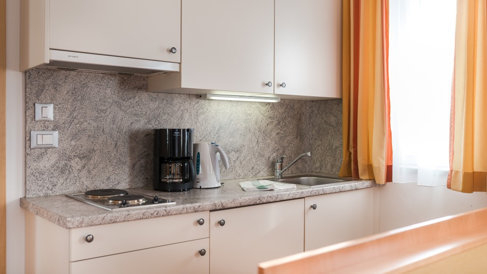 Anm. d. Red.: Wurde nicht neu umgebaut. Mit getrenntem Wohn- und Schlafraum, Küchenzeile mit Kühlschrank, Geschirr, Kaffeemaschine, zwei Kochstellen, gemütlicher Wohnraum mit Sitzecke und ausziehbarer Couch, Safe, TV, Badezimmer mit Dusche/WC, Südbalkon, Frühstücksbuffet auf Anfrage.