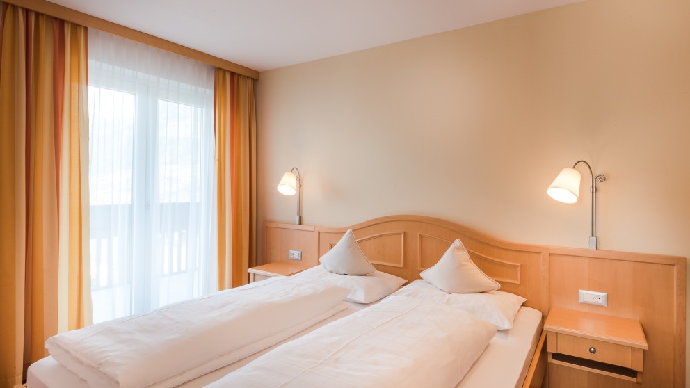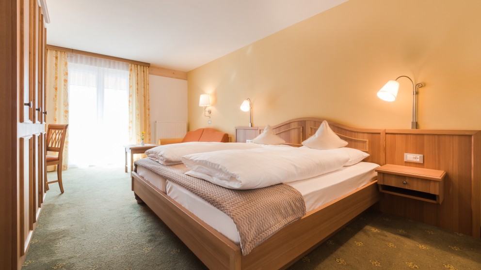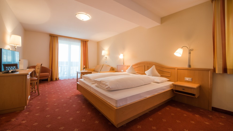 Anm. d. Red.: Wurde nicht neu umgebaut. Doppelzimmer mit Südbalkon, gemütliche ausziehbare Couch, Schreibtisch, Safe, TV, Dusche & WC. Kann auch als Mehrbettzimmer verwendet werden.