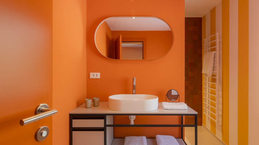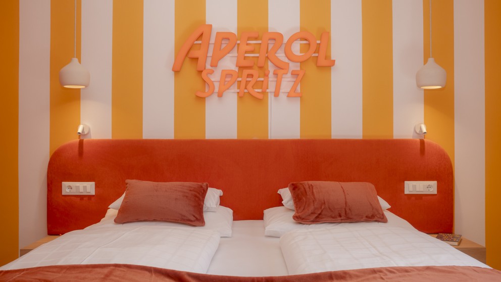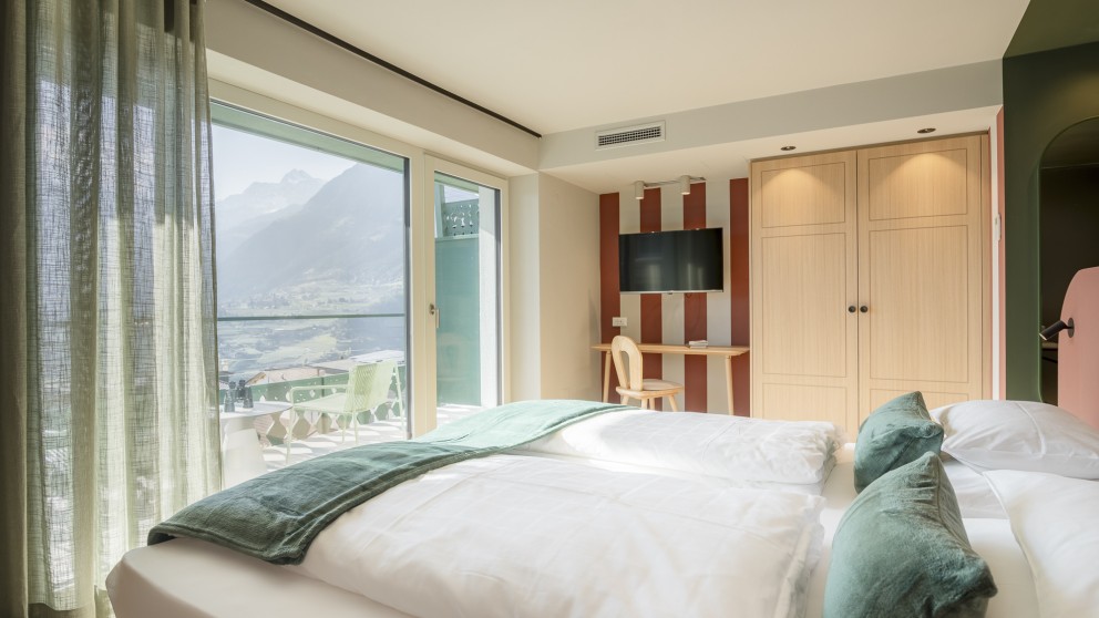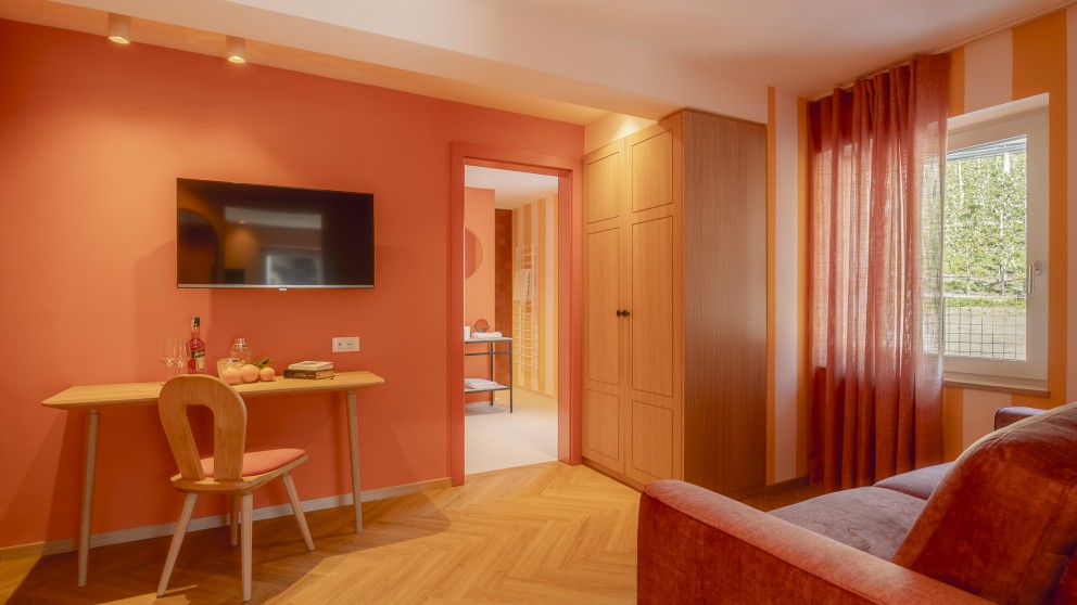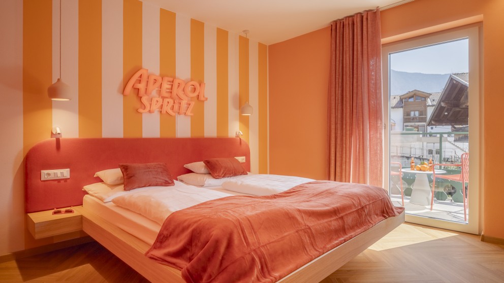 Living la Dolce Vita - das gehört in Schenna natürlich dazu. Wenn wir ganz ganz ehrlich sind: wir haben dieses Zimmer einfach unserem Lieblingsgetränk gewidmet: Aperol Spritz. Deshalb ist es das bunteste Zimmer im Haus. Ausgestattet ist dieses Zimmer natürlich mit allen Must Haves: Kingsize-Bett, Regendusche, Schreibtisch, Satelliten TV, W-lan, WC, Schrank, Balkon, ausziehbare Couch. Der Ausblick? Naja, nach hinten raus.