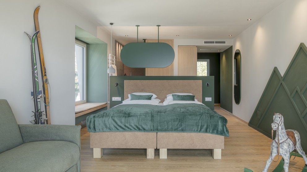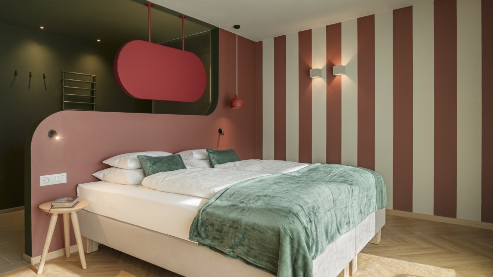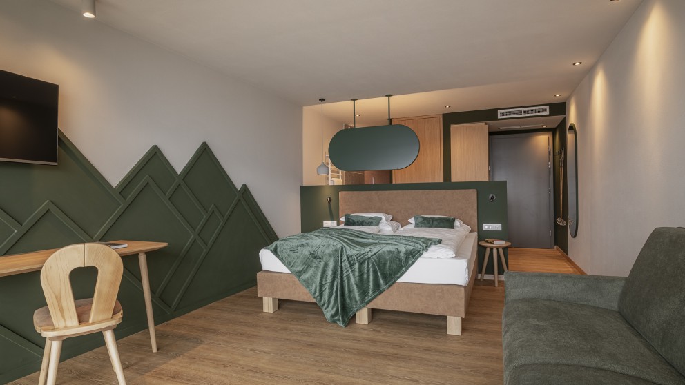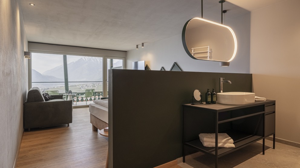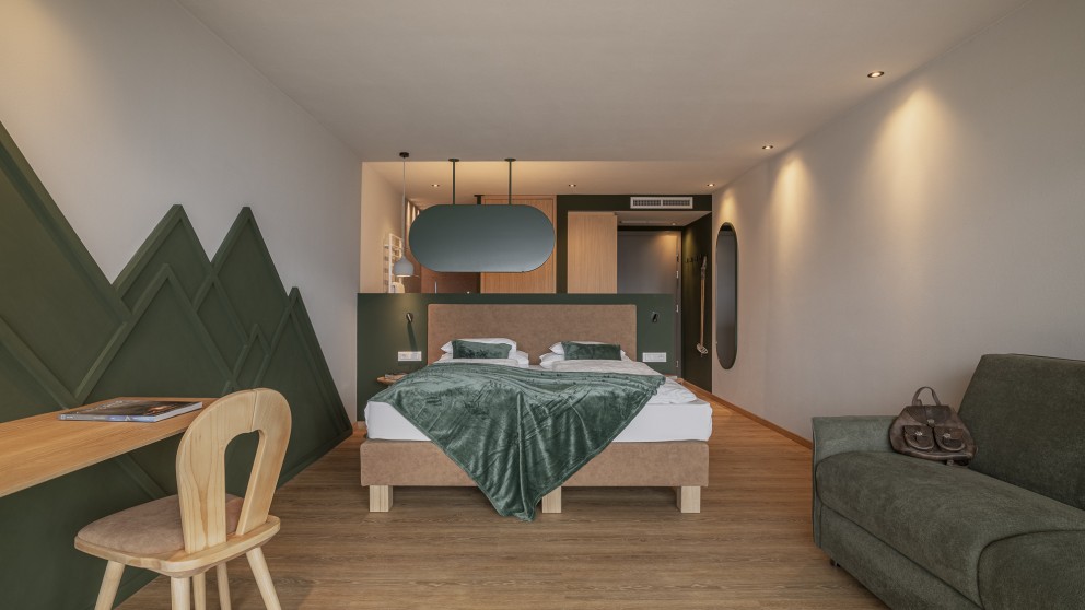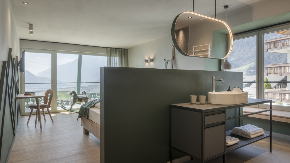 Eine Hommage an die Lust, die uns alle hier packt. Die Wanderlust. Kleine Details im Zimmer inszenieren das umliegende Wandergebiet. Ausgestattet ist dieses Zimmer natürlich mit allen Must Haves: Kingsize-Bett, Regendusche, Schreibtisch, Satelliten TV, W-lan, freistehender Waschtisch, abgetrenntes WC, Schrank und Balkon. Der Ausblick? Fantastisch nach vorne raus.