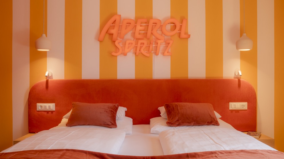 Living la Dolce Vita - that's part and parcel of life in Scena. To be completely honest, we have simply dedicated this room to our favourite drink: Aperol Spritz. That's why it's the most colourful room in the house. Of course, this room is equipped with all the must-haves: king-size bed, rain shower, desk, satellite TV, Wi-Fi, free-standing washbasin, WC, wardrobe, balcony, pull-out couch. The view? Well, out the back.