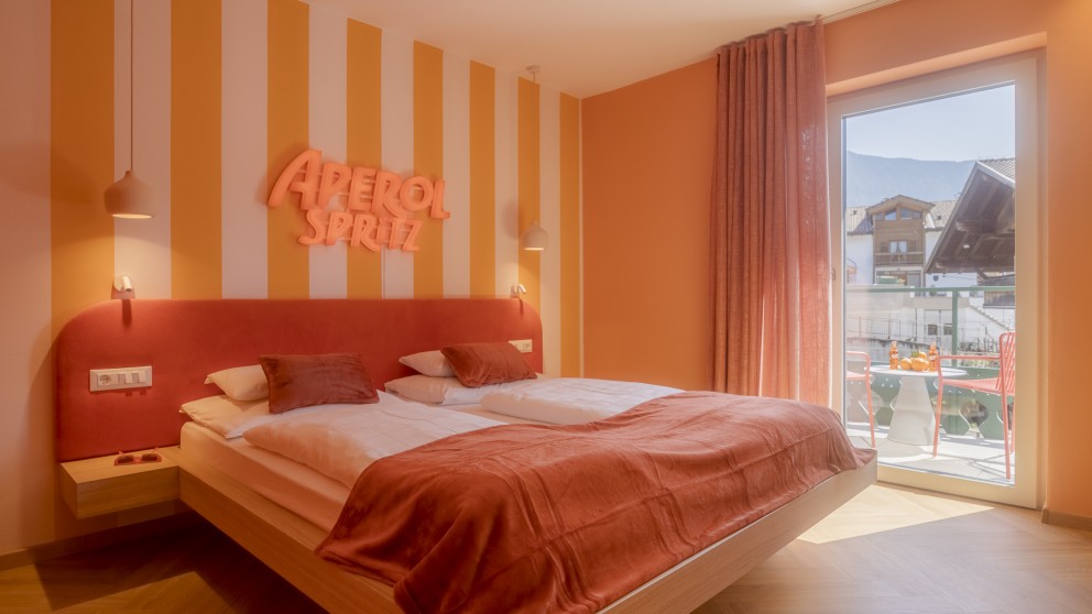 In tutta onestà, abbiamo semplicemente dedicato questa stanza alla nostra bevanda preferita: l'Aperol Spritz. Ecco perché è la stanza più colorata della casa. Naturalmente, questa camera è dotata di tutti i must: letto king-size, doccia a pioggia, scrivania, TV satellitare, Wi-Fi, lavabo indipendente, WC, armadio, balcone, divano estraibile. La vista? Beh, sul retro.